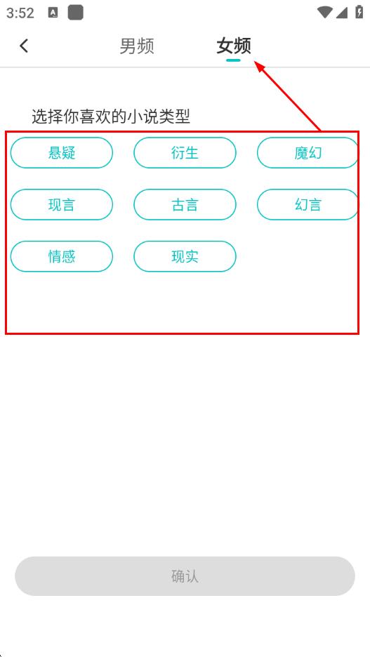 5、点击女频选项卡,选择你感兴趣的小说类型,如悬疑、古言、幻言等。