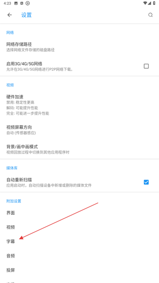 3、进入设置的界面内,在附加设置下点击字幕的按钮。