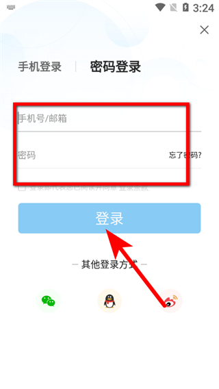 4、在密码登录页面,输入手机号/邮箱和密码后,点击登录按钮完成账号登录操作。