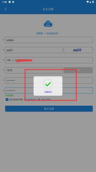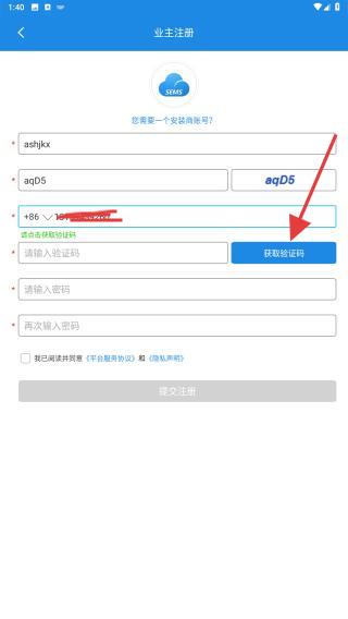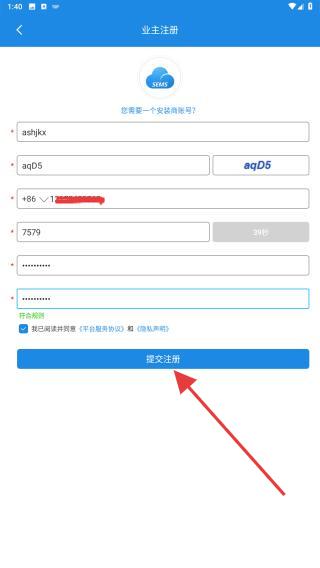 3、将收到的验证码输入其中,再设置密码后,再点击提交注册的按钮。