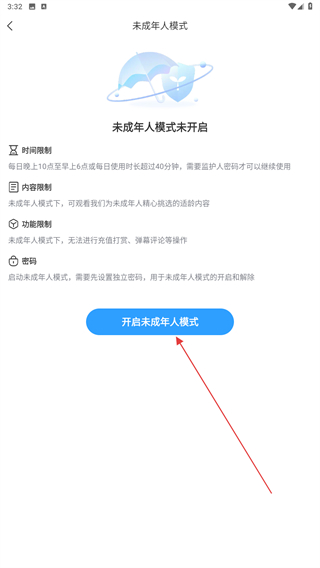 4、进入该页面内,了解后再点击开启未成年人模式即可。
