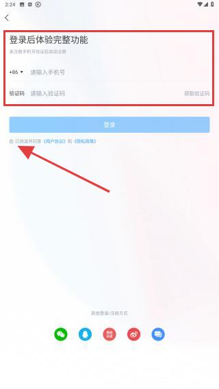 2、在此页面中,需要填写手机号并获取验证码,再勾选用户协议和隐私政策后点击登录。