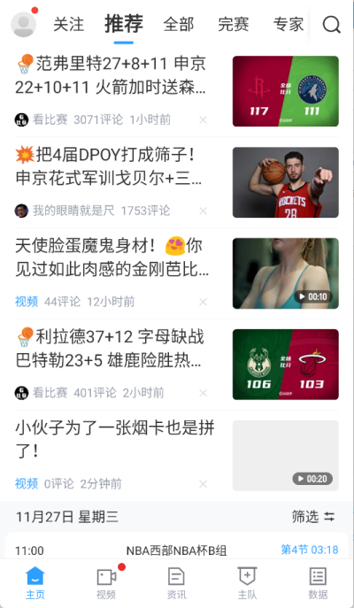 2、点击下方的视频按钮进入短视频观看界面,在这里为大家带来更多的篮球、足球相关的短视频内容;