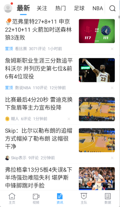 3、点击资讯选项可以查看当下热门的体育资讯,还有足球、NBA等栏目分类,点击相应分类可以查看对应的内容资源;