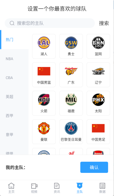 4、点击主队选项可以设置一个自己喜欢的球队,设置后会实时为你推送当前球队的信息,让你不错过该球队最新的消息内容;
