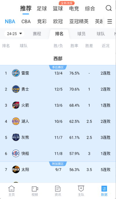 5、在数据功能界面可以查看所有队伍的赛程、排名以及球员球队信息等。