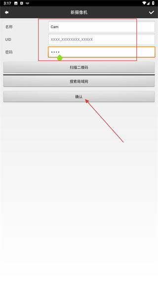 3、输入设备名称、UID、密码后,再点击确认按钮即可。