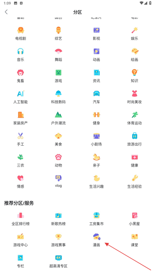2、进入分区的界面内,在推荐分区/服务下找到并点击漫画。