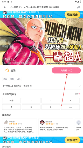 4、进入该漫画的详情页面内,点击免费看18话即可开始看。