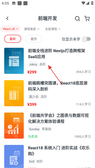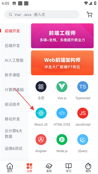 2、在课程分类页面,选择React.JS可进入该技术方向课程列表页面。