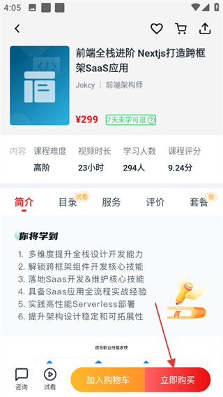 4、在课程详情页面,点击立即购买可完成该课程的购买操作。