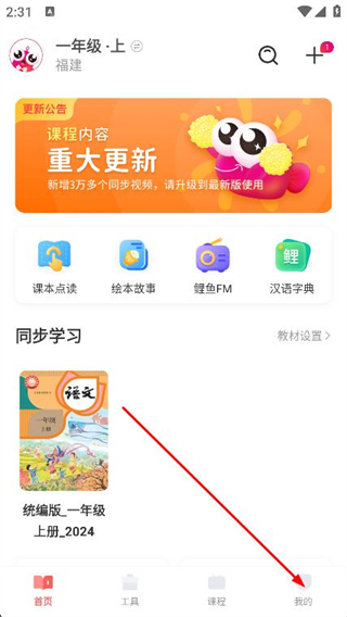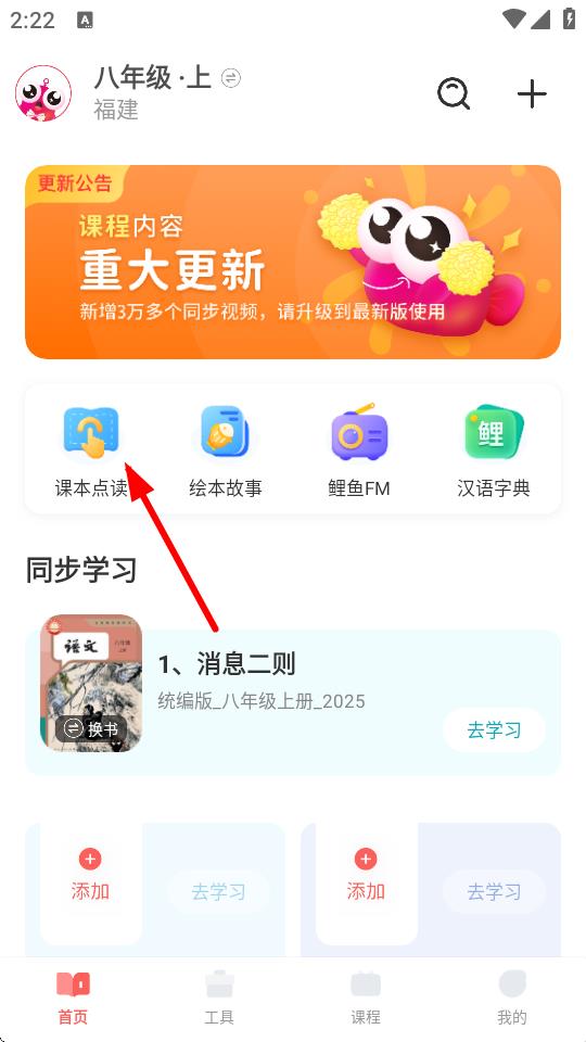 1、在锂鱼辅导的首页,需要点击课本点读,进入我的书架界面。