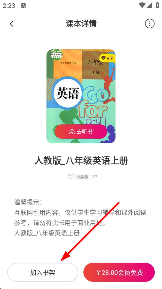 4、在课本详情页面,点击加入书架,完成书本添加到书架的操作。