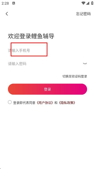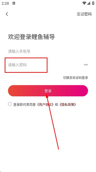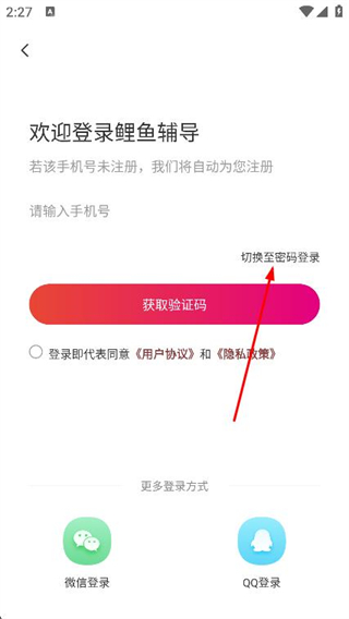 1、打开鲤鱼辅导app,点击切换至密码登录选项。