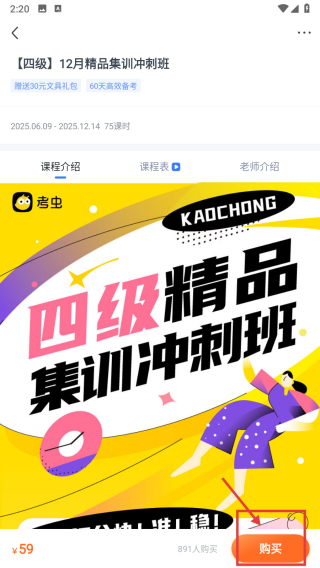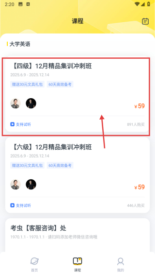 2、在课程列表页面,点击四级12月精品集训冲刺班课程条目,进入课程详情页。