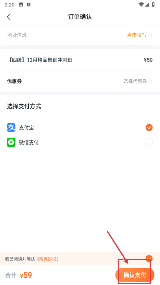 4、在订单确认页面,选择支付方式,勾选我已阅读并确认购课协议,点击确认支付按钮,完成该课程的购买操作。