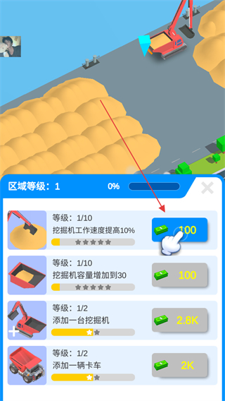 1、花费金币升级挖掘机,如提升工作速度,增加区域等级进度。
