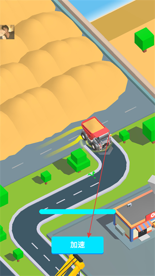 2、驾驶卡车运输沙土,点击加速按钮提升行驶速度,高效运输。