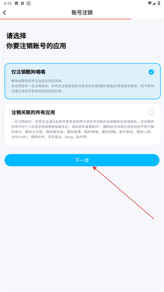 4、进入账号注销的页面内,勾选仅注销酷狗唱唱再点击下一步。