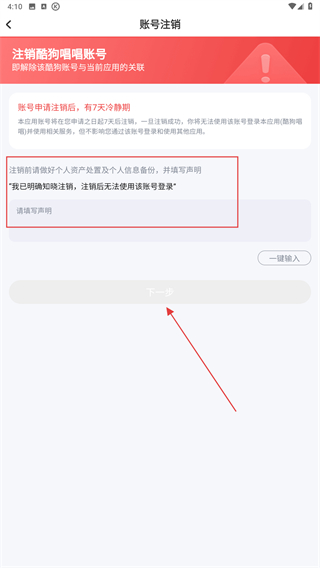 5、在输入框内输入相关文字后,再点击下一步即可完成注销。