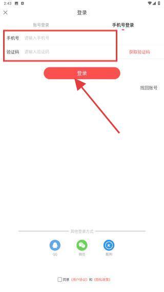 3、点击后会弹出登录选项界面,输入手机号码,点击获取验证码,再点击登录的按钮。