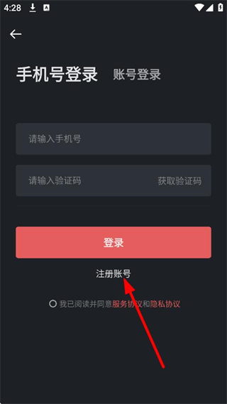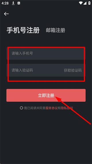 3、输入手机号,点击获取验证码并输入后点击立即注册。