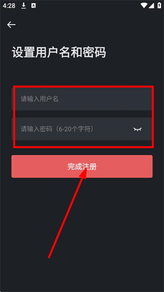 4、输入用户名和密码后点击完成注册,完成账号注册操作。