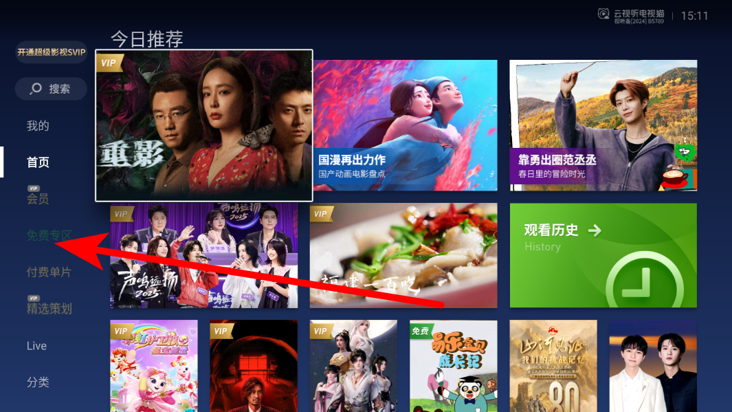 1、在电视猫视频app首页,点击左侧免费专区选项,进入免费内容页面。
