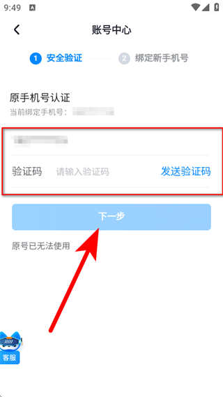 4、输入原手机号的验证码,点击下一步后,按照提示绑定新手机号即可。