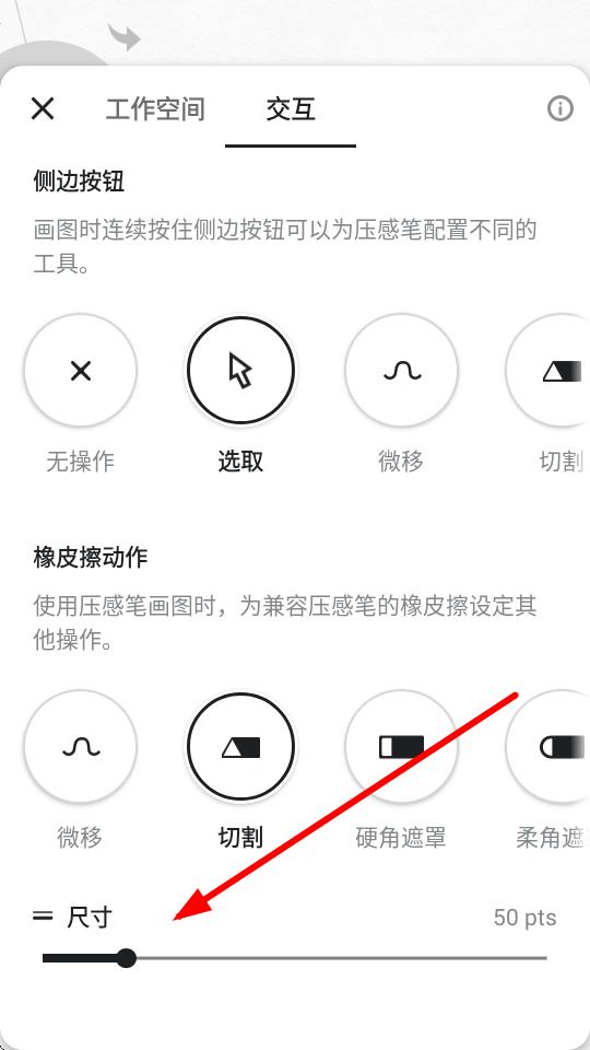 4、在设置的交互页面,找到尺寸的滑块,来调整橡皮擦尺寸。