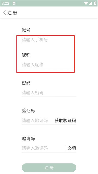 2、在注册页面,点击输入框,填写手机号和昵称。
