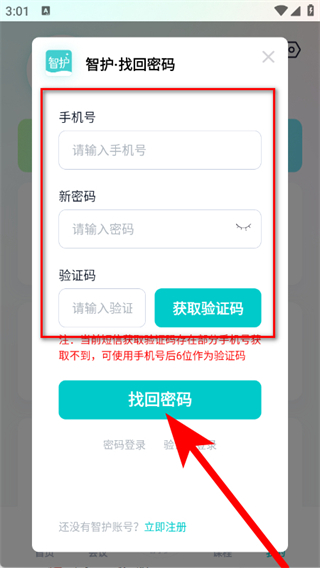 4、输入手机号、新密码、验证码,点击找回密码,完成密码找回。