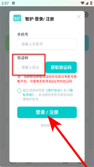4、输入收到的短信验证码,勾选后,点击登录注册按钮,完成注册。