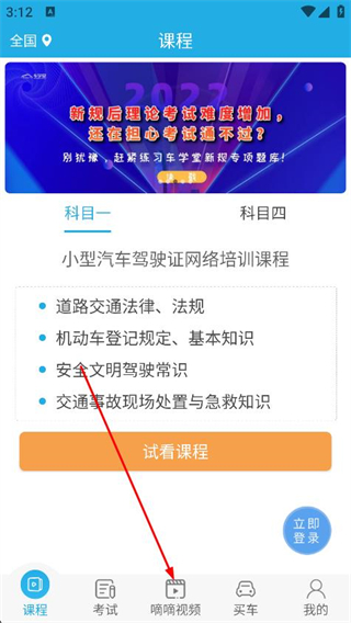 1、打开车学堂app,点击底部导航栏的嘀嘀视频选项。