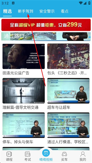 2、在嘀嘀视频页面中,选择并点击新手驾到标签。