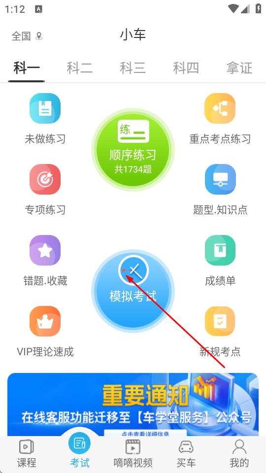 1、打开车学堂APP,进入考试页面,选择科目,点击模拟考试图标。