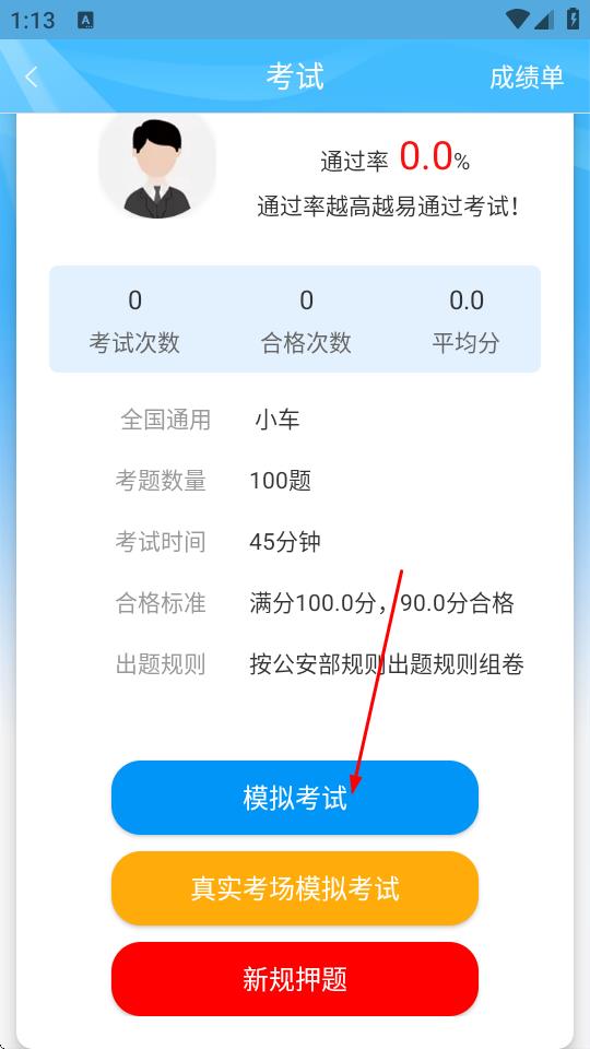 2、在模拟考试介绍界面,查看考试相关信息,如考题数量、考试时间、合格标准等,点击模拟考试按钮。