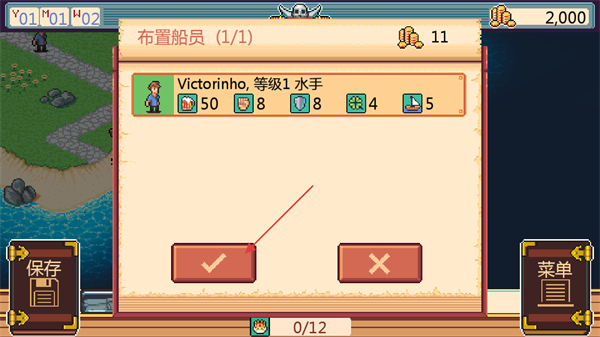 3、布置船员,选择合适的船员如等级1的水手Victorninho,点击确认完成船员布置。