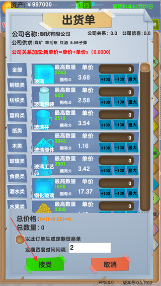 4、查看出货单,确认货物种类、单价等信息,点击接受完成出货,获取收益,推动公司发展。