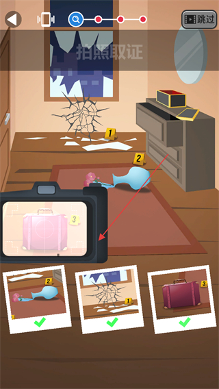 1、拍照取证,拍摄案发现场标有编号的线索物品,如破碎窗户、花瓶、行李箱等,收集现场证据。