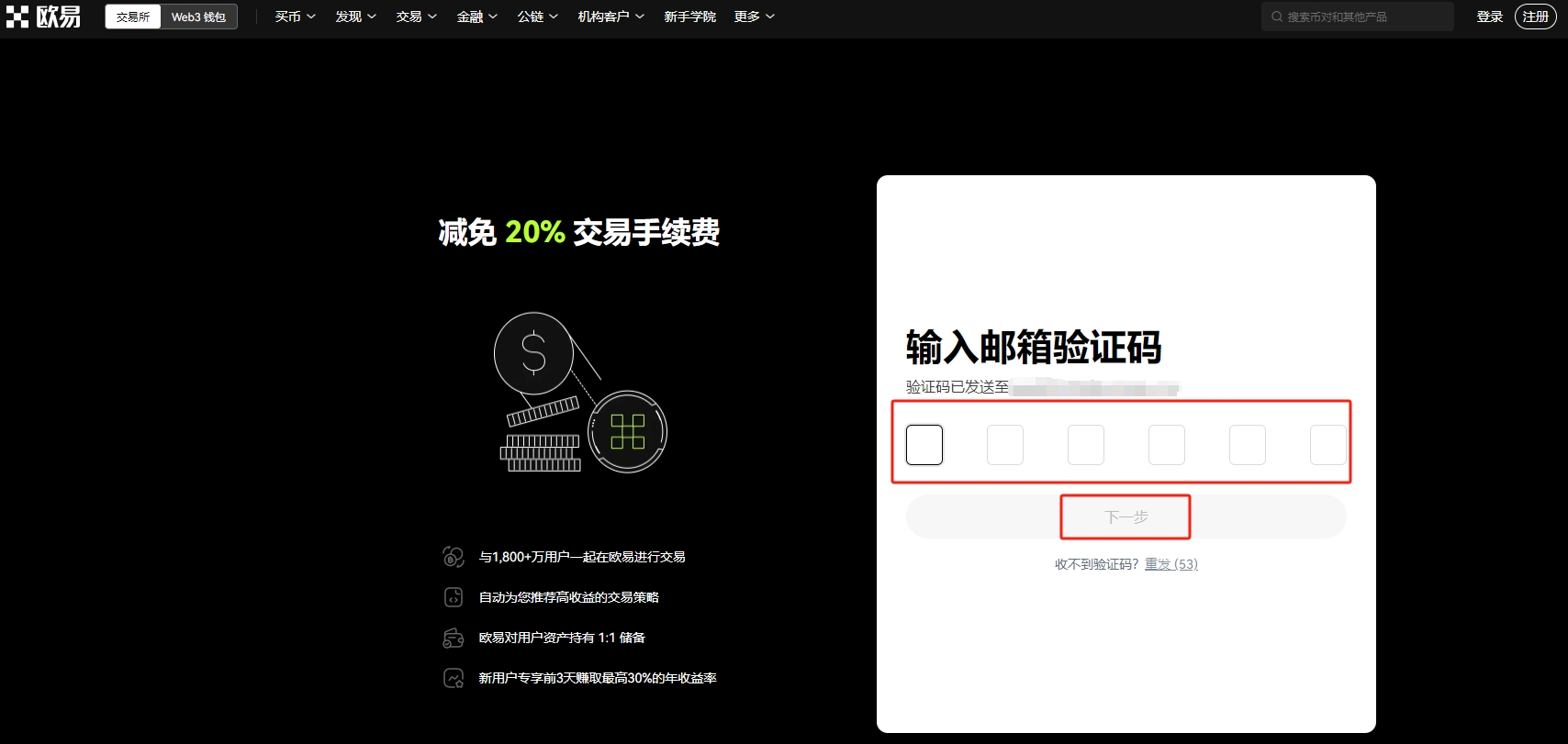 输入发送至此邮箱的验证码,点击【下一步】。如果遇到问题,也可选择欧易使用邮箱或手机号直接注册。