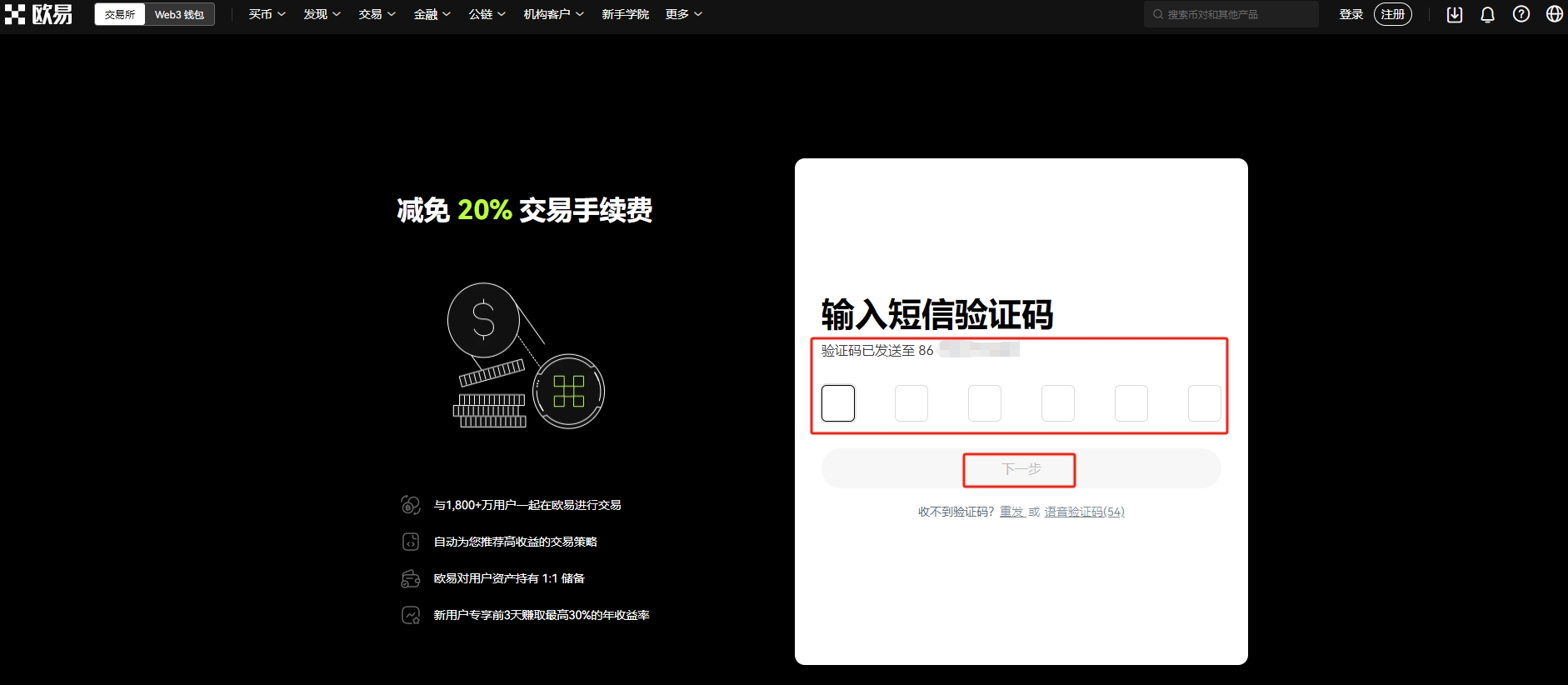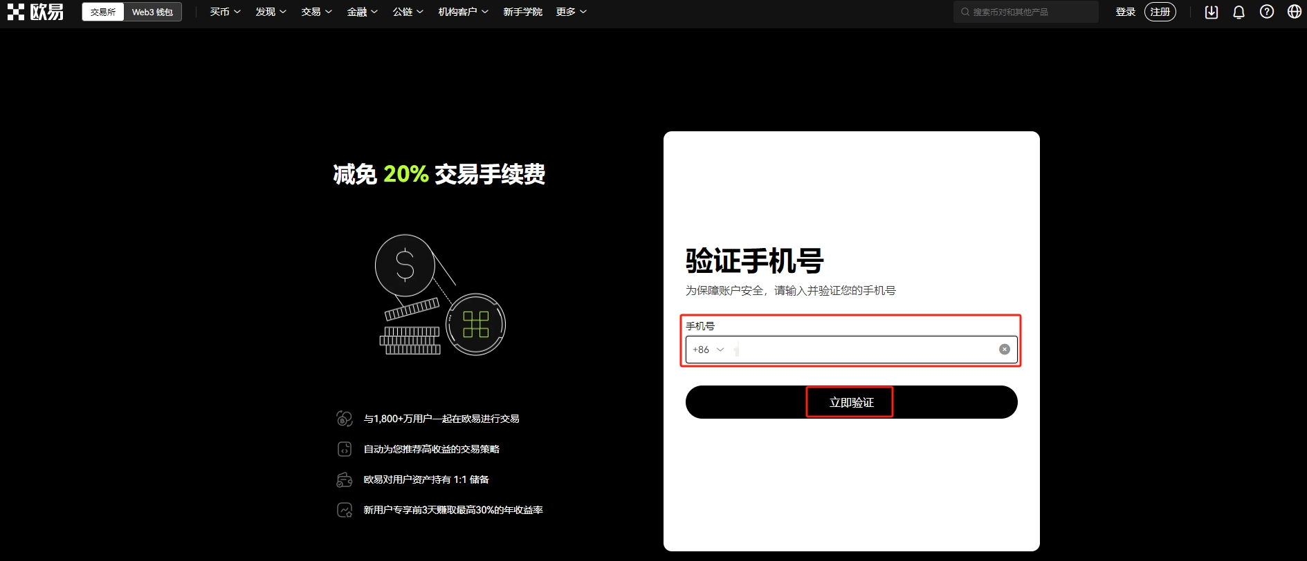 输入自己的手机号码,点击【立即验证】。新用户也可以通过下载欧易APP直接在手机上完成验证。