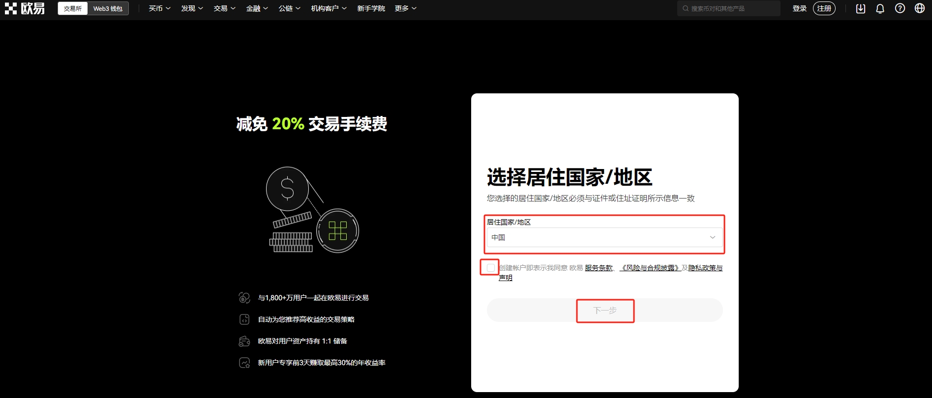 居住地/地区选择"中国",勾选同意服务条款,点击【下一步】。整个过程中,可随时下载欧易APP在手机端操作。
