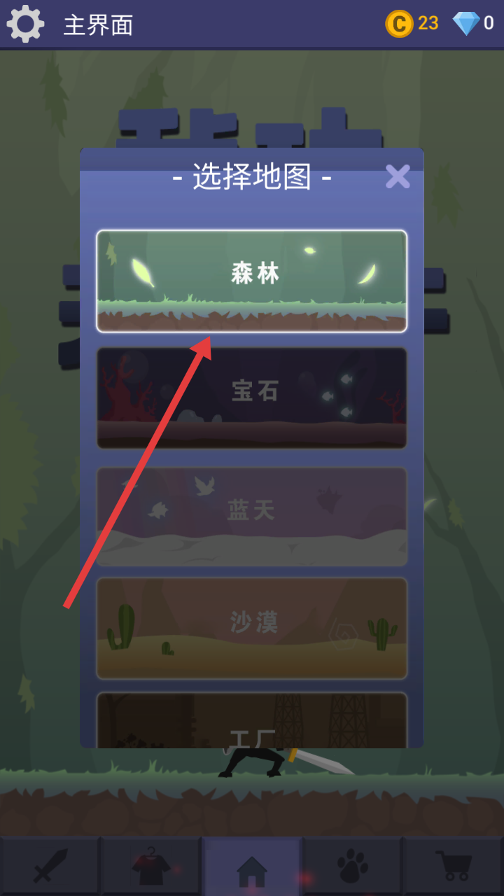 2、选择森林地图,进入森林场景,开始与敌人展开战斗,积累金币。