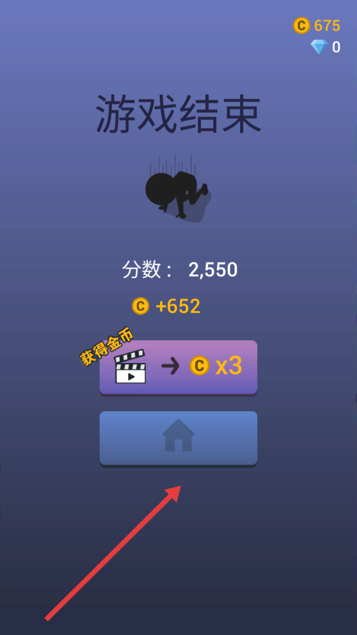 4、游戏结束后,可看视频获金币或返回主界面,用金币强化角色,提升战力后再挑战以得更高分数。