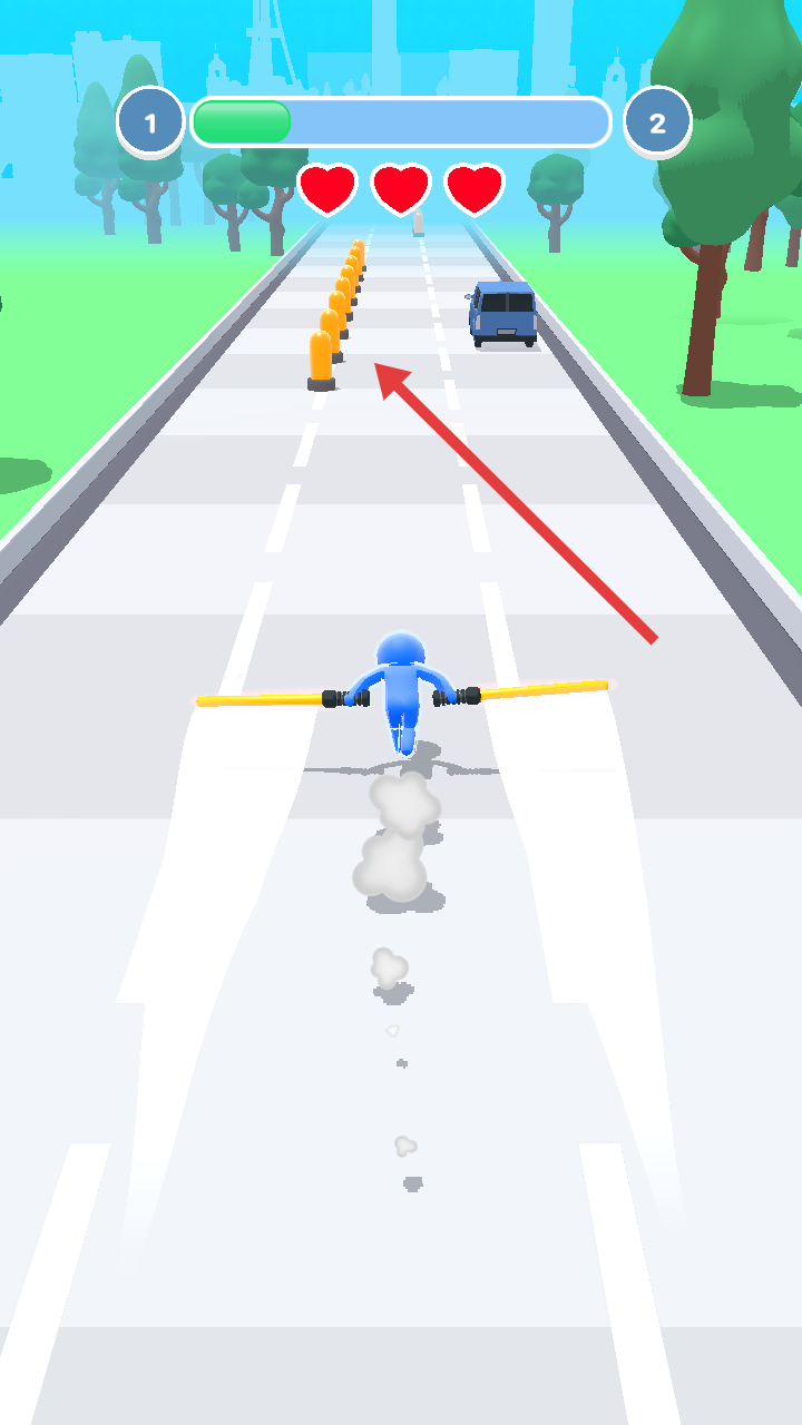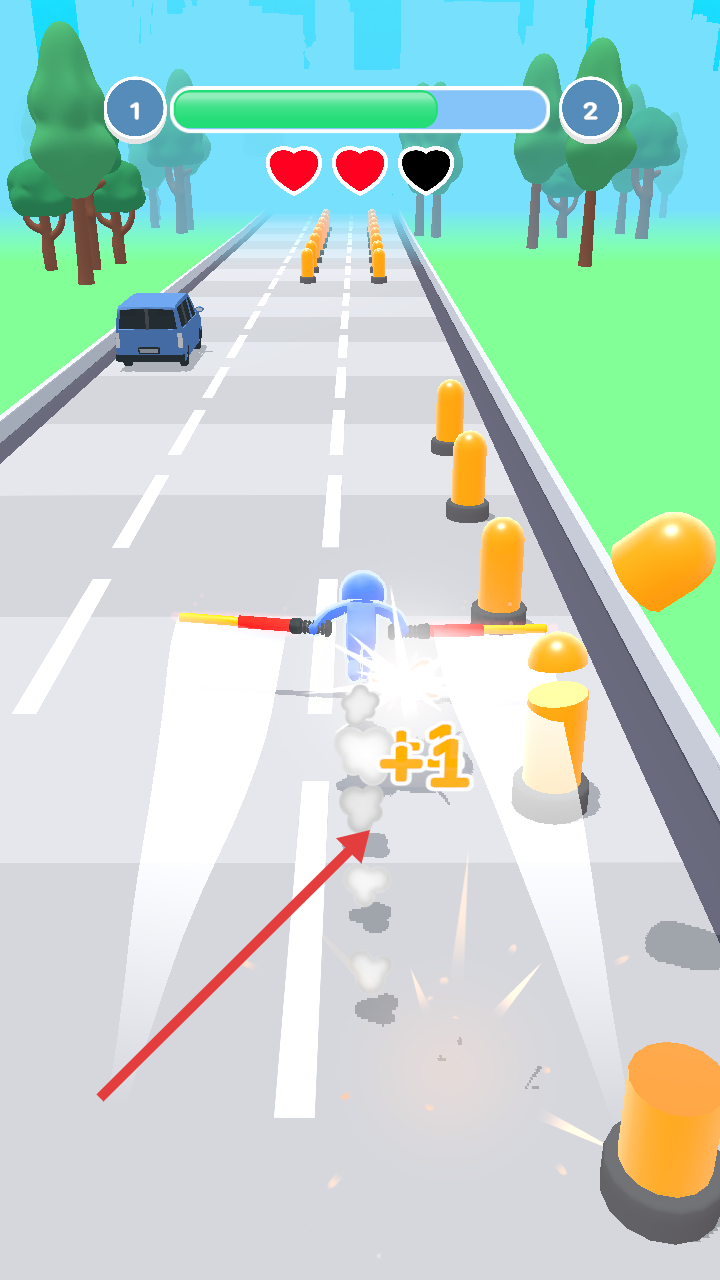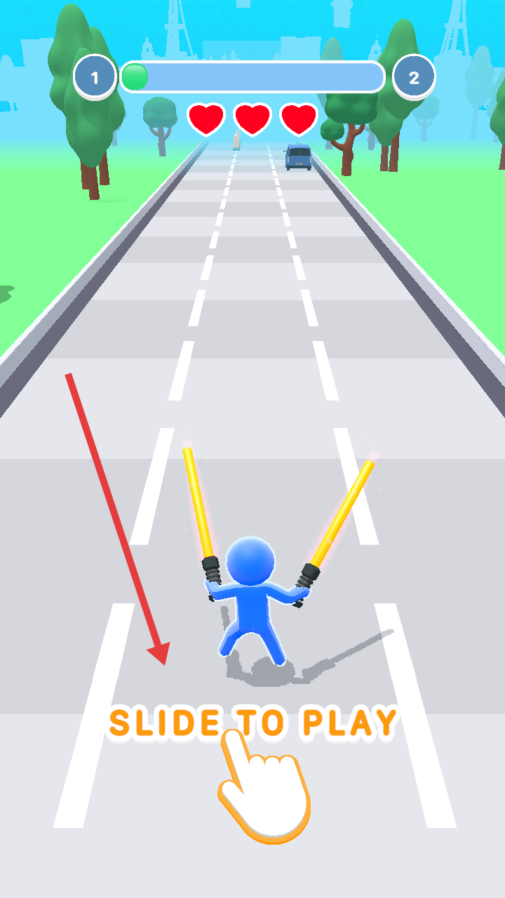 1、滑动操作,在道路场景中操控蓝色角色,开启挥舞光剑的挑战。