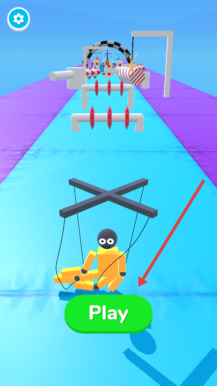 1、点击Play开始,在赛道场景中操控木偶角色,开启躲避障碍的挑战。
