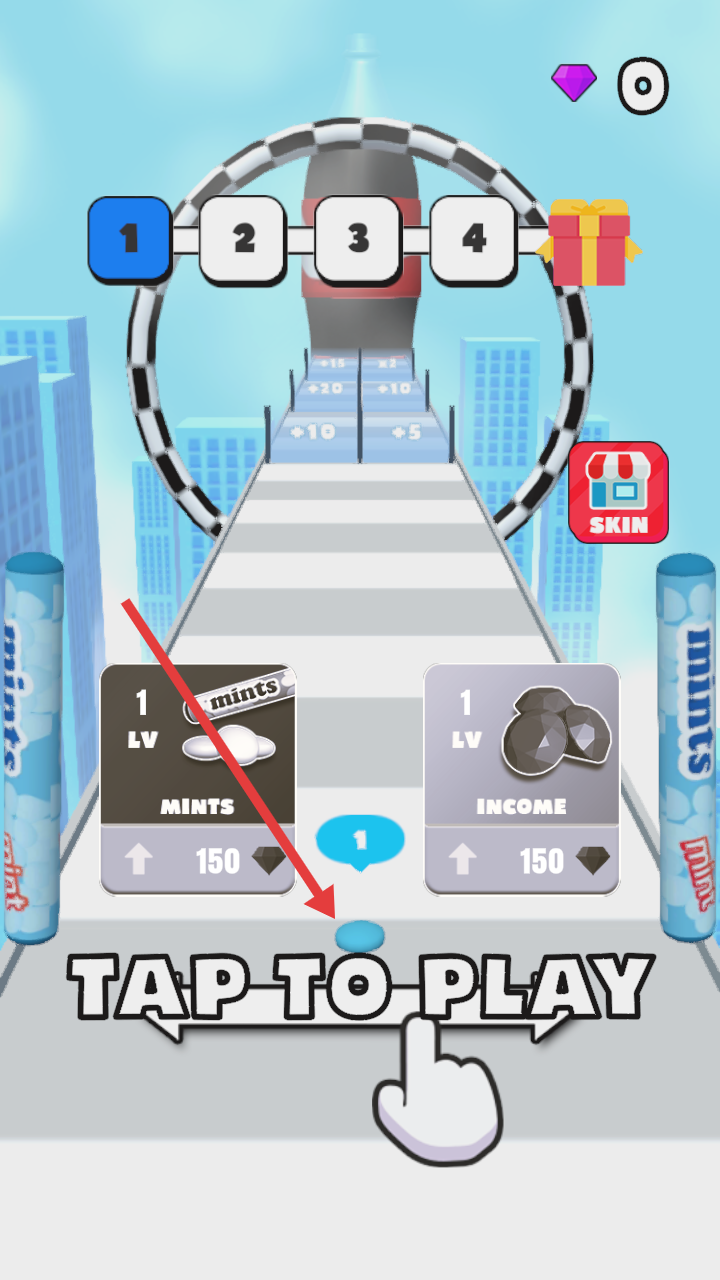 1、点击TAPTOPLAY开始,在城市赛道场景中操控蓝色物体,开启收集薄荷糖的挑战。