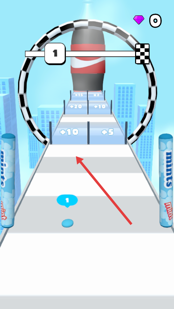 2、操控蓝色物体移动,收集赛道上的薄荷糖,向关卡深处推进,积累薄荷糖数量。