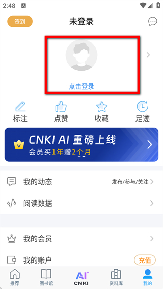 1、在全球学术快报个人界面,点击点击登录区域,进入登录选择页面。